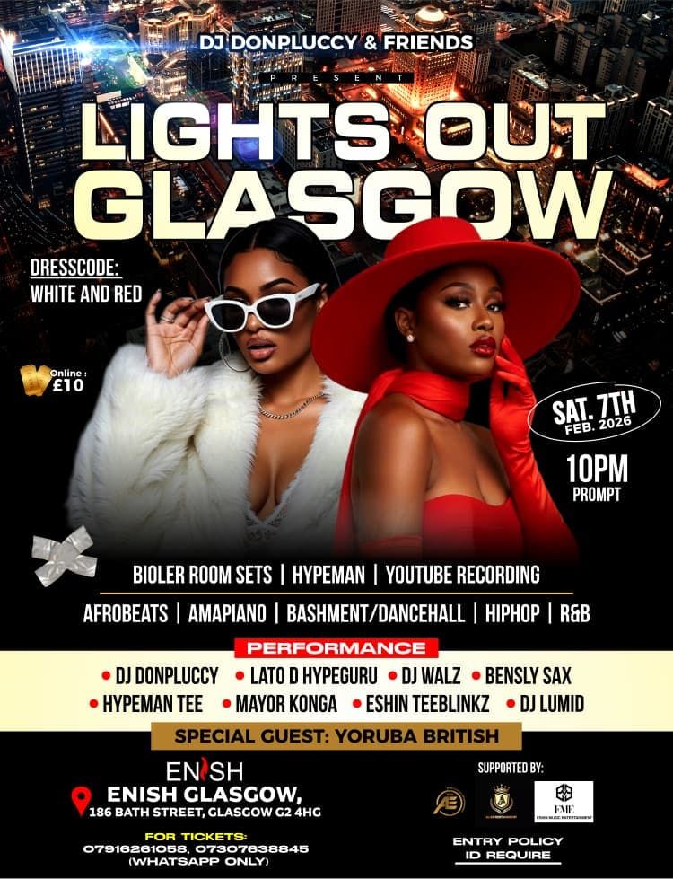 LIGHTS OUT GLASGOW is a high-energy nightlife experience bringing together elite DJs, powerful hype men, and live instrumentalists for one unforgettable night.