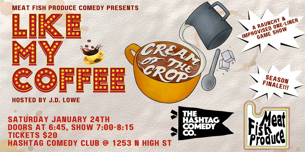 Meat Fish Produce Comedy is proud to present the season finale of "Like My Coffee: Cream of the Crop", an improvised game show live at Hashtag Comedy Club! This season, we've been proud to showcase 63 amazing improvisers, comedians, and performers coming up with one liner jokes based on your suggestions and the structure "I like my lovers like I like my *blank*". We've asked the winners of all of the shows, plus some additional friends, to come back for the Champion of Champions show to determine who's got the raunchiest and silliest jokes out there. The host, J.D. Lowe, will judge your reactions and score accordingly, and has prepared surprises for our players.