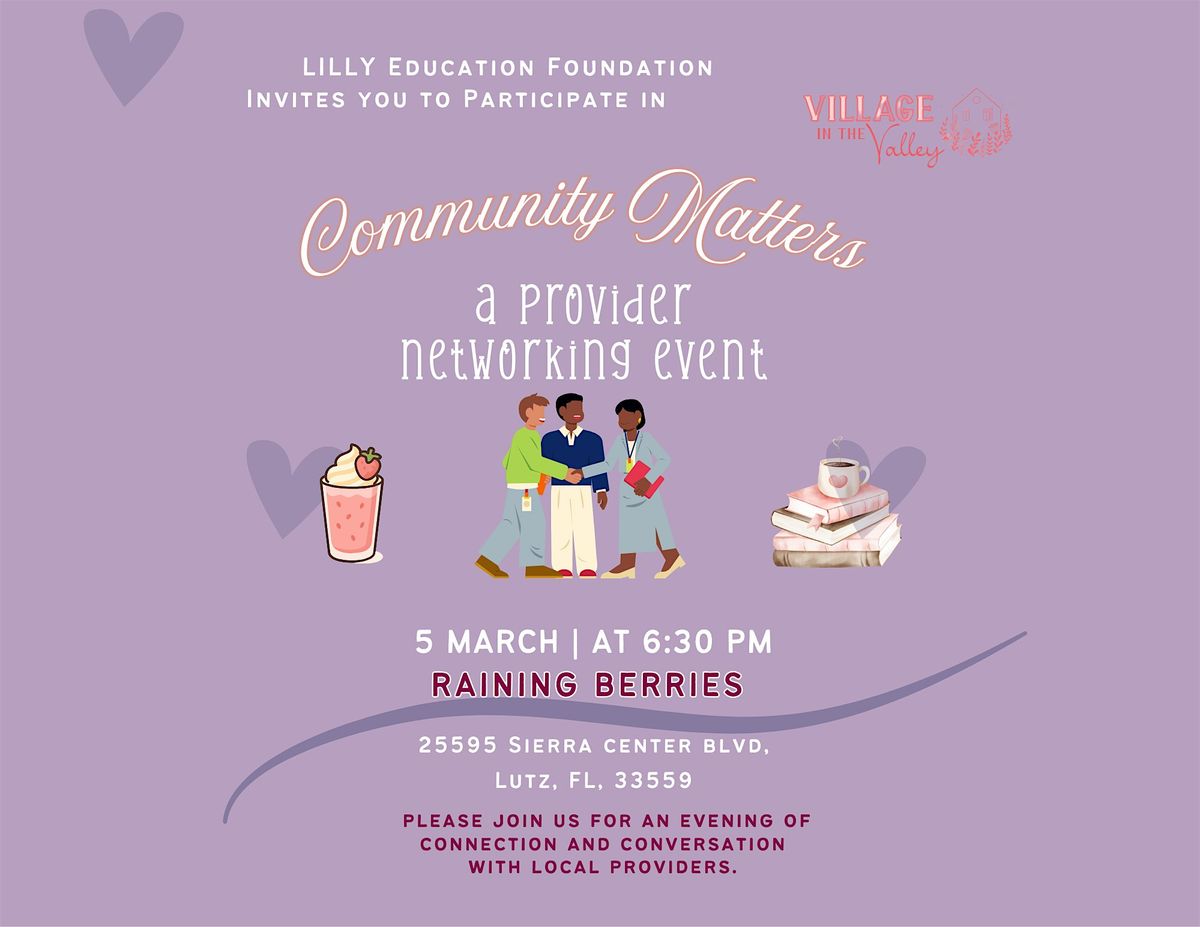 We have been deeply moved by the positive engagement, interest, and feedback we have received about the February Village in the Valley speed networking event. It is an honor to share space with such passionate people! This has inspired the topic and focus of our March Village in the Valley; we intend to focus on deepening connections with providers. Given this, along with partnership inquiries, we will dedicate time to presenting on new opporunities to connect with LILLY Education Foundation. We will present on the development of our Community Partnership Network, including its heart/mission and membership information for prospective partners. Following this, we will have some informal networking intended for connection and discussion with us and fellow providers with shared passions.
