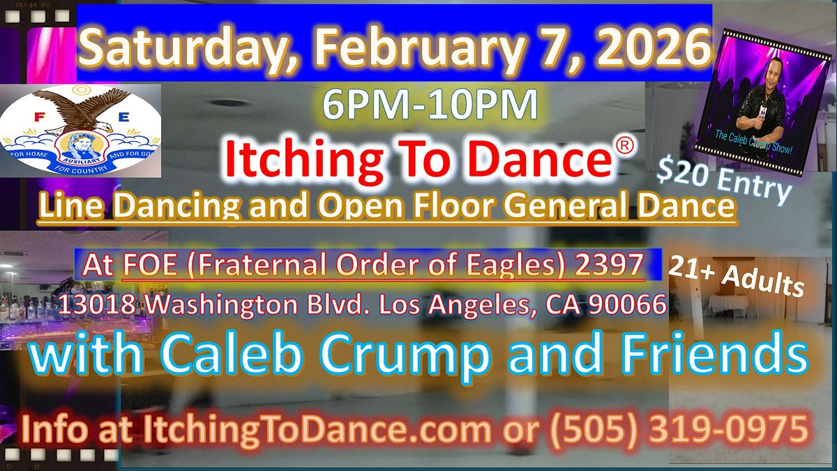 Mark your Calendars forSaturday Evening February 7, 2026 from 6:00 PM to 10:00 PM, and Join Itching To Dance® with Caleb Crump and Friends for Soulful Line Dancing and General Open Floor Dancing, as we Line, Latin, Country-Western, and Soulful R&B Dance, at FOE (Fraternal Order of Eagles) 2397, located at 13018 Washington Blvd. Los Angeles, CA 90066.