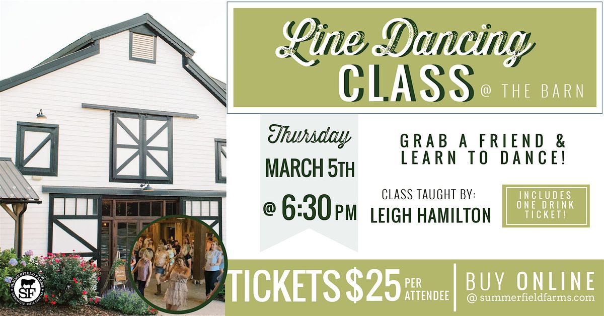 Join us and instructor Leigh Hamilton for a fun and energetic Line Dancing Class at Summerfield Farms! Grab your boots and get ready to dance the night away.