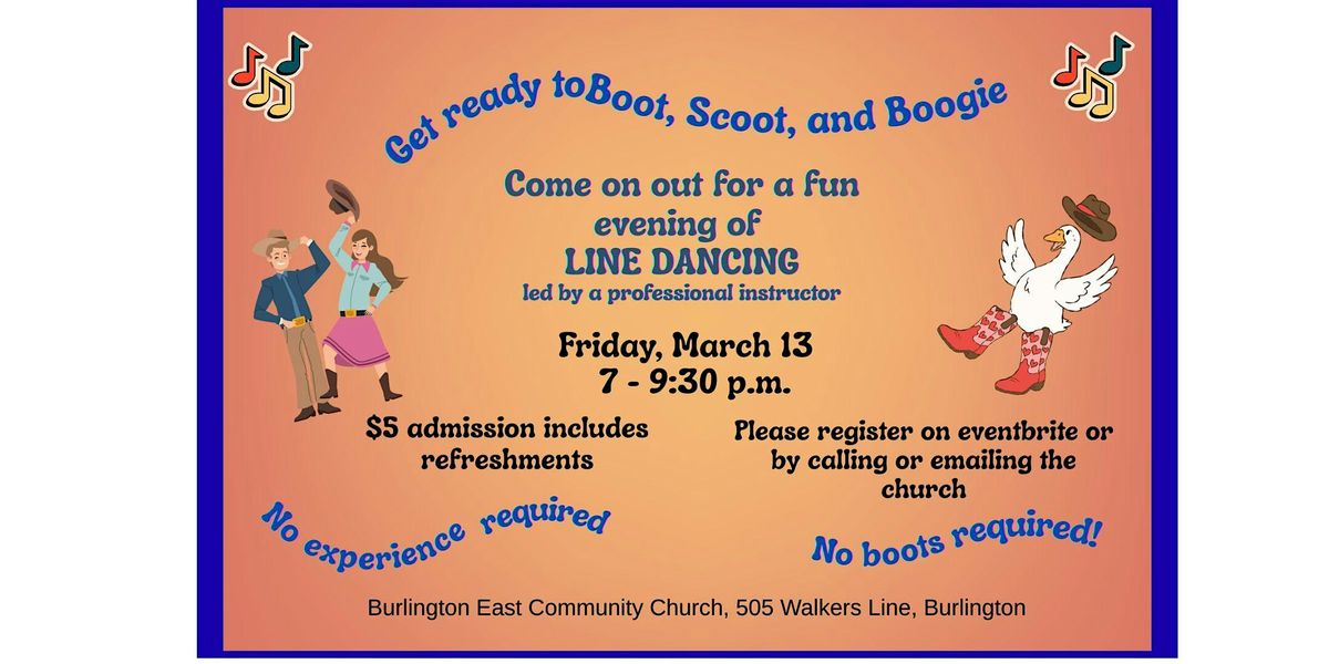 Join us for a fun night of Line Dancing at Burlington East Community Church. No experience or partner needed. Our professional instructor will guide you through—just bring your energy and a smile. Let's kick up our heels and have some laughs.
