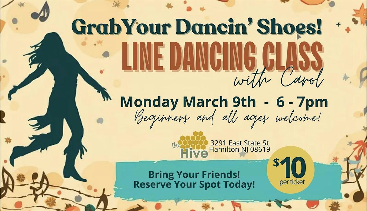 Welcome to Line Dancing with Carol at The Hive! Get ready to kick up your dancing shoes on March 9, 2026 at 6:00 PM. Carol will teach you the latest moves and have you dancing like a pro in no time. Don't miss out on this fun-filled evening of music and dancing. Grab your friends and join us for a boot-scootin' good time! Begginers and all ages welcome!