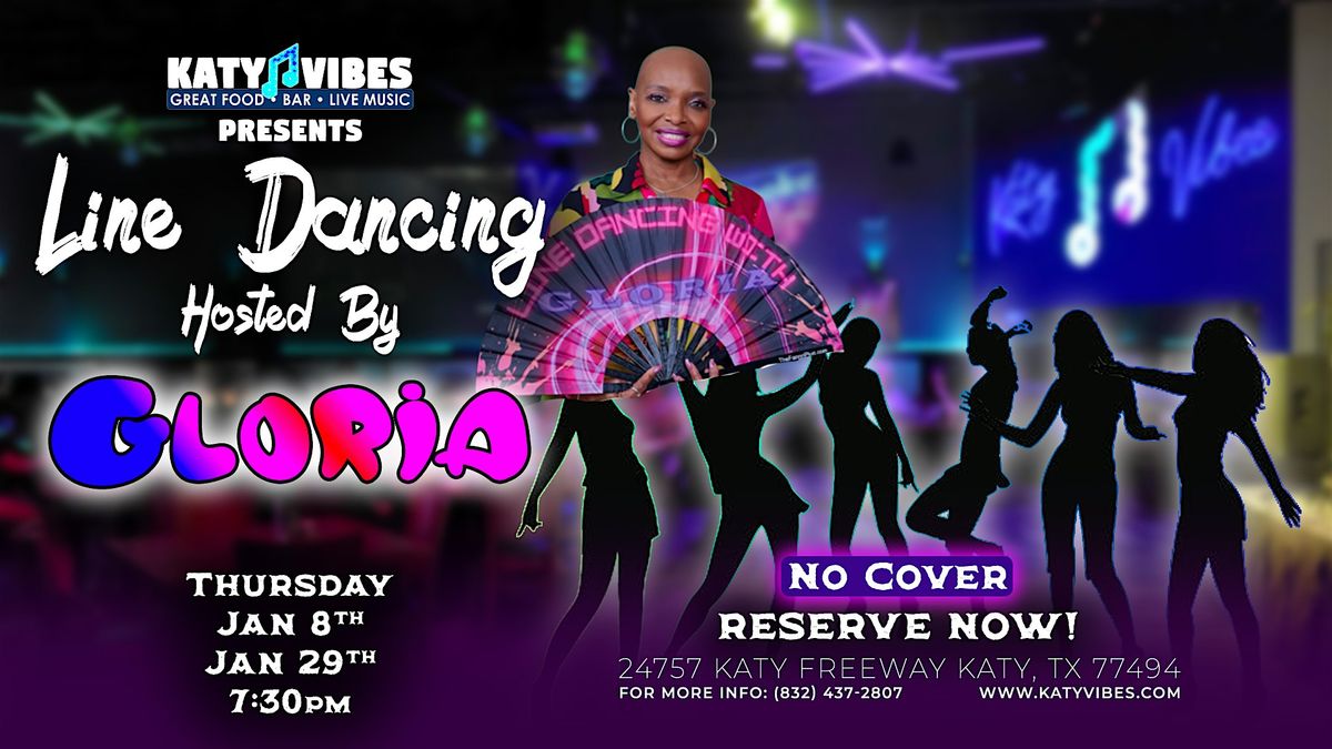 🔥 Thursday January eighth and Thursday January twenty-ninth at seven-thirty, Gloria leads electric line dancing nights at Katy Vibes. 🎉
