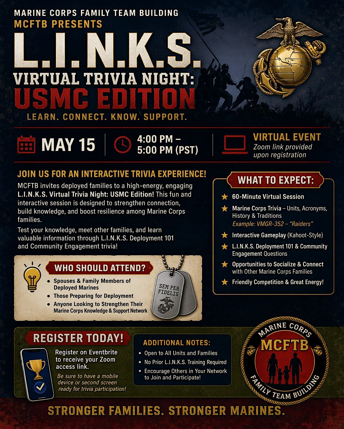 Join Marine Corps Family Team Building (MCFTB) for an interactive and high-energy L.I.N.K.S. Virtual Trivia Night: USMC Edition designed to strengthen connection, knowledge, and resilience among deployed families.
