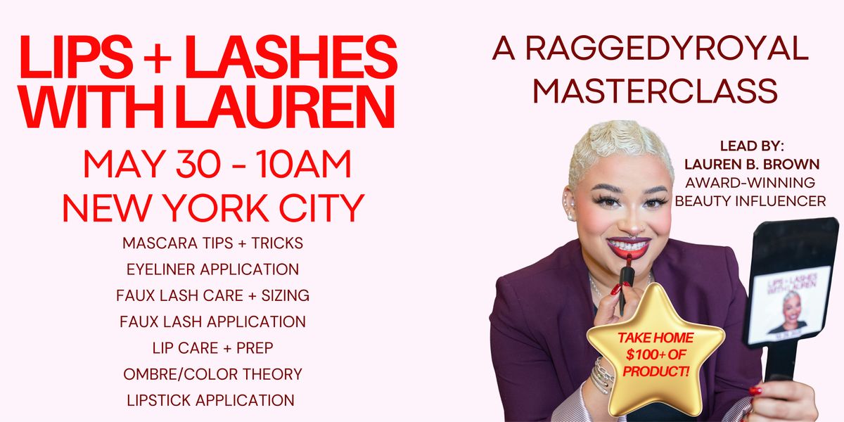 Lips + Lashes with Lauren: A RaggedyRoyal Masterclass will cover achieving the perfect red lip combination and faux lash application. All lip + lash materials are included. Participants can expect to learn about: