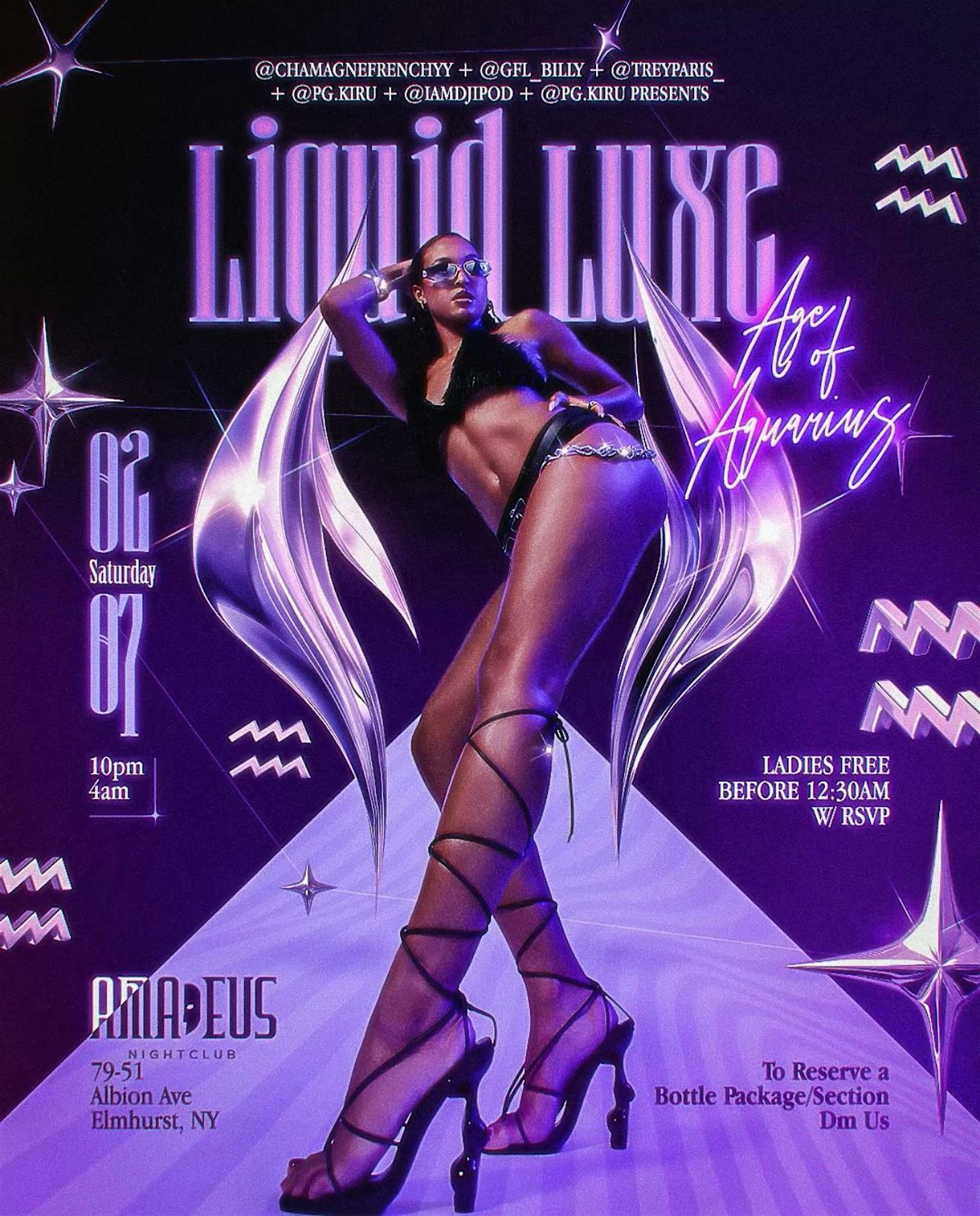 Get ready to dive into a night of vibes and style! LIQUID LUXE: AGE OF AQUARIUS is your ultimate in-person experience where luxury meets cosmic energy. Expect a chill atmosphere filled with cool beats, stunning visuals, and plenty of good times. Don’t miss out on this epic gathering—come flow with the crowd and embrace the Age of Aquarius in true liquid luxe fashion!