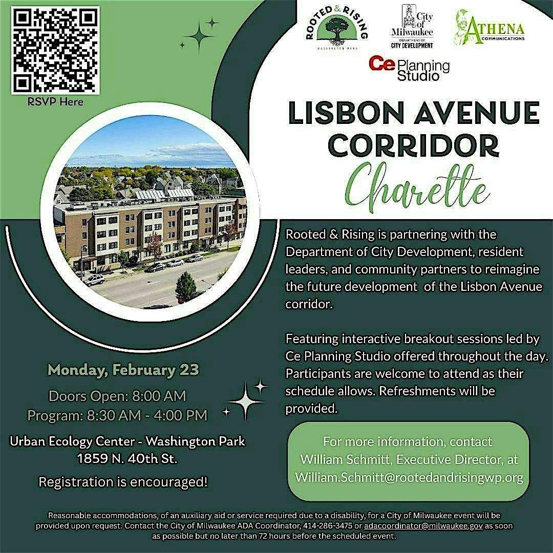 Join us for the Lisbon Ave Corridor Charette in Milwaukee's Washington Park neighborhood in partnership with the Milwaukee City Development, Ce Planning Studio, and Athena Communications.