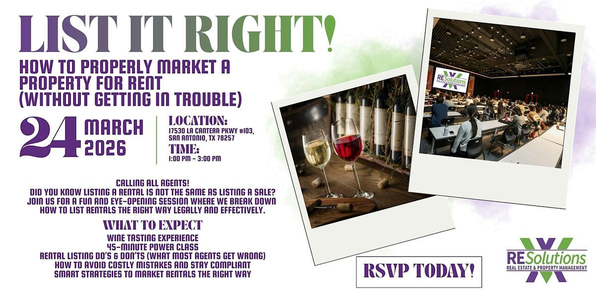 #SanAntonioRealtors #RentalCompliance #RealEstateTraining #REsolutionsXV #AgentSuccess #RentalTips #StayCompliant #FreeEvent