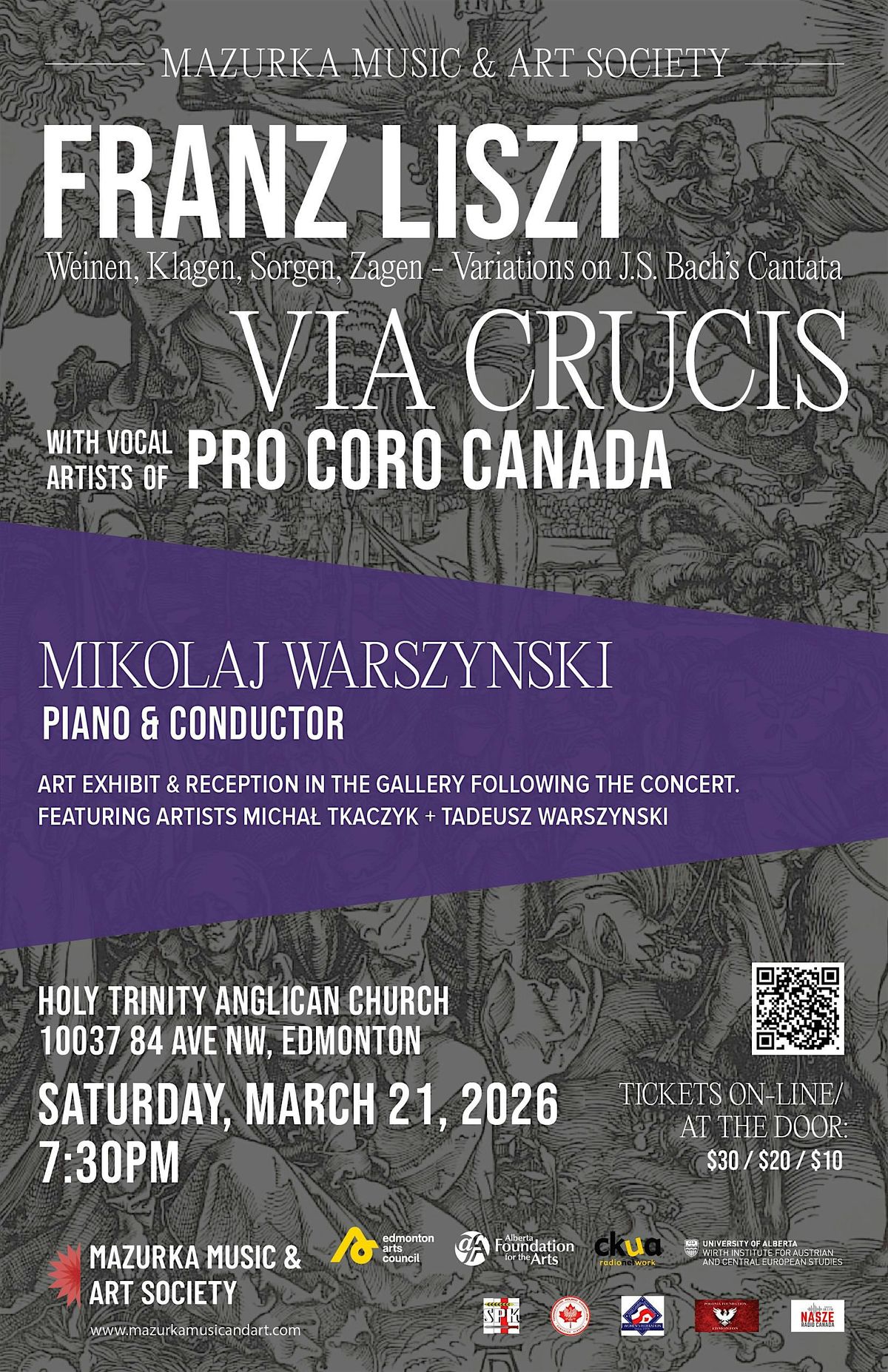 In addition to the Via Crucis, in the first half there will also be a solo piano performance of Liszt’s Weinen, Klagen, Sorgen, Zagen Variations on Bach’s Cantata No. 12.
