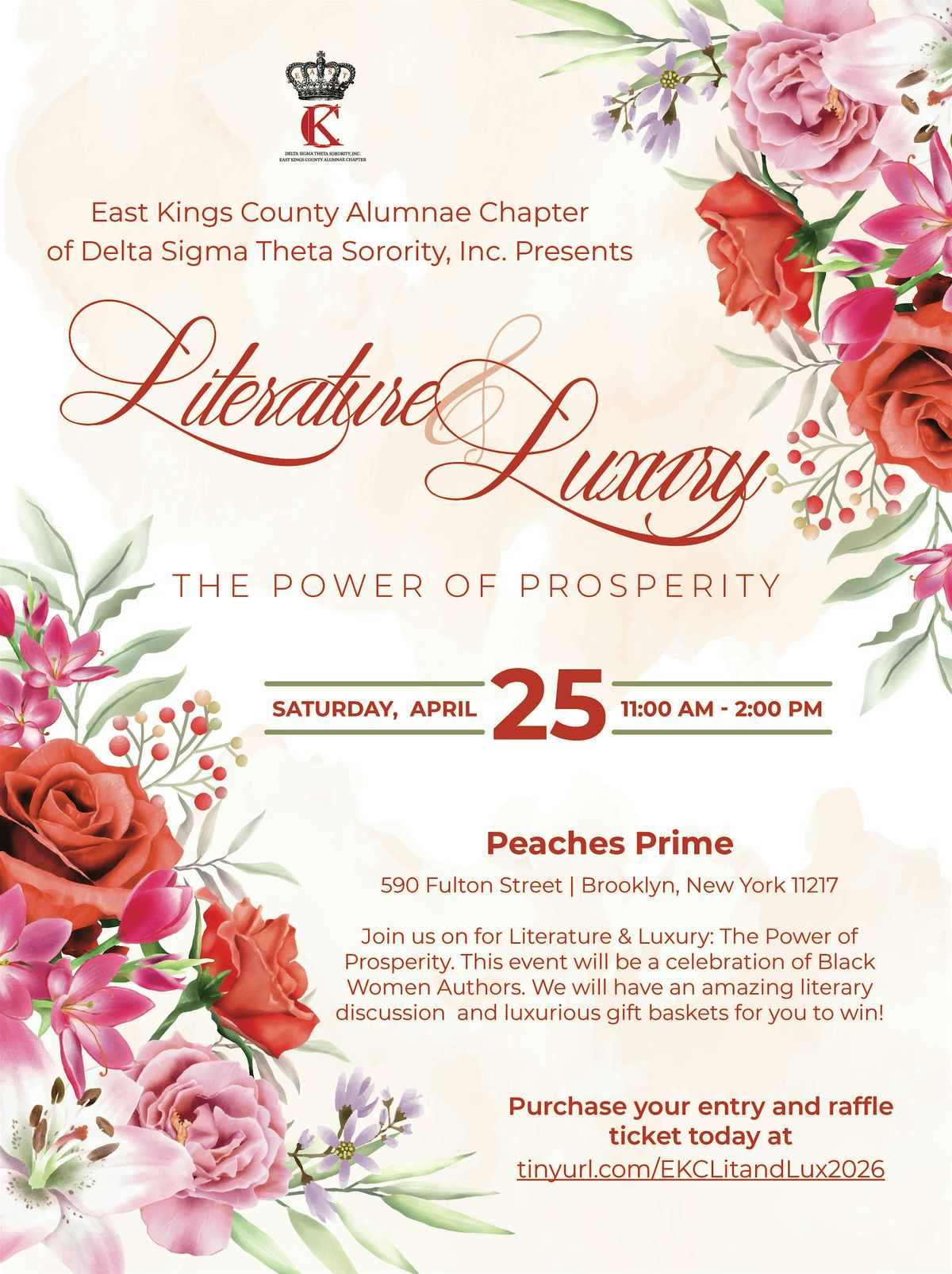 Join us on Saturday, April 25, 2026 from 11:00 am - 2:00 pm for Literature & Luxury: The Power of Prosperity. This event will be a celebration of Black Women Authors taking place at Peaches Prime located at 590 Fulton Street, Brooklyn, NY 11217.