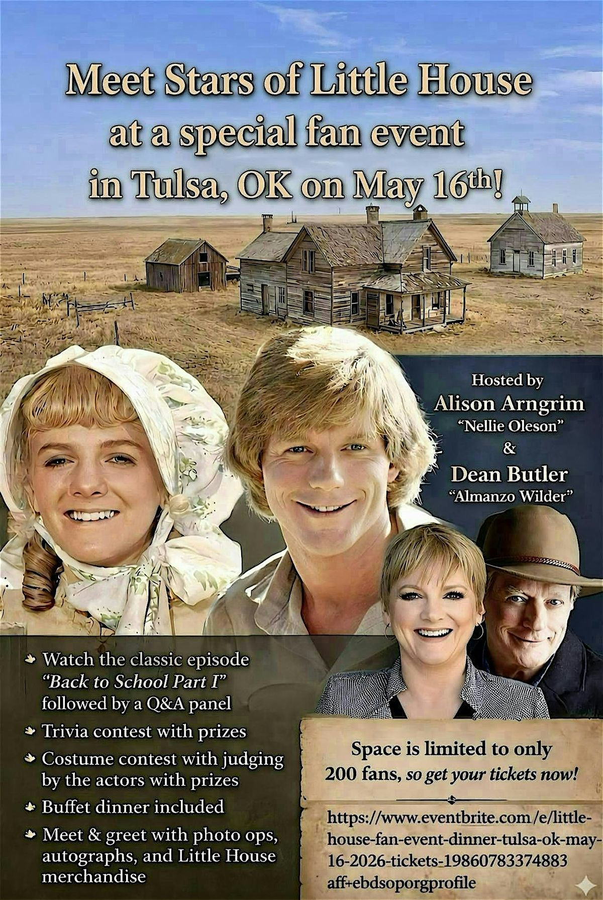 Meet Little House stars Alison Arngrim (Nellie) & Dean Butler (Almanzo) for an interactive fan event & dinner in Tulsa, OK on May 16, 2026!!About this Event