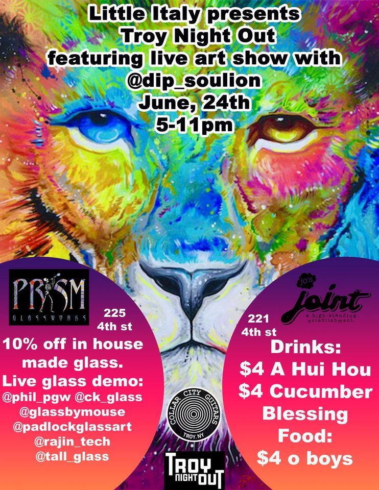 Troy's Little Italy is please to have the return of Dip_soulion as a guest painter. He will have plenty of work available and be doing live art out on the sidewalk alongside Prism Glassworks in house glass artist. @phil_pgw @ck_glass @glassbymouse @rajin_tech @padlockglassworks @tall_glass, who will be doing glass demos all night. They will also have 10% off all made in house glass.Stop by Jo's Joint for some drink and food specials. $4 A Hui Hou (it’s a fruited wheat ale) and $4 Cucumber Blessing (cucumber ale) and $4 o boys.