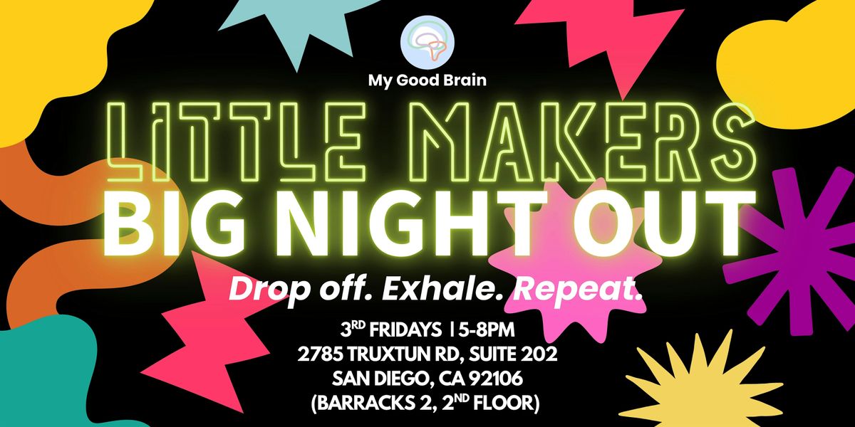 Little Makers, Big Night Out is a monthly, drop-off art and wellness evening for children ages 4–12 at our studio in Liberty Station. Every session is designed by a licensed clinical psychologist and visual artist — and your kids will spend three hours making real art, building emotional skills, and having the kind of fun that's actually good for them.
