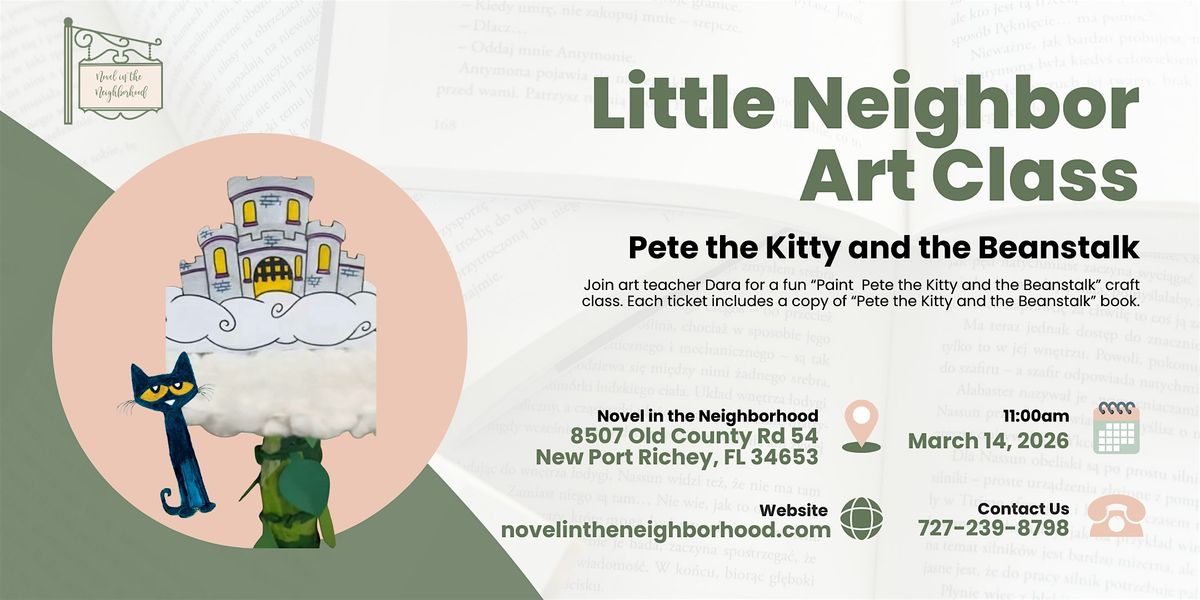 Join us for a morning of painting and fun as former art teacher Dara Tucker shows little neighbors ages 4-8 how to paint their very own Pete the Kitty beanstalk craft! Each $20 event ticket includes materials and a copy of "Pete the Kitty and the Beanstalk." Registration is required and space is limited.