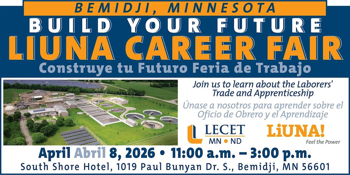 Looking to jumpstart your career in construction? LIUNA is hosting a Construction Career Fair in Bemidji, MN! This in-person event is the perfect chance to meet industry pros, learn about exciting job opportunities with Union contractors, and get your foot in the door. Whether you're new to construction and interested in Apprenticeship training options or looking to move up, don't miss out on connecting with top employers and discovering your future in the building trades. See you there!