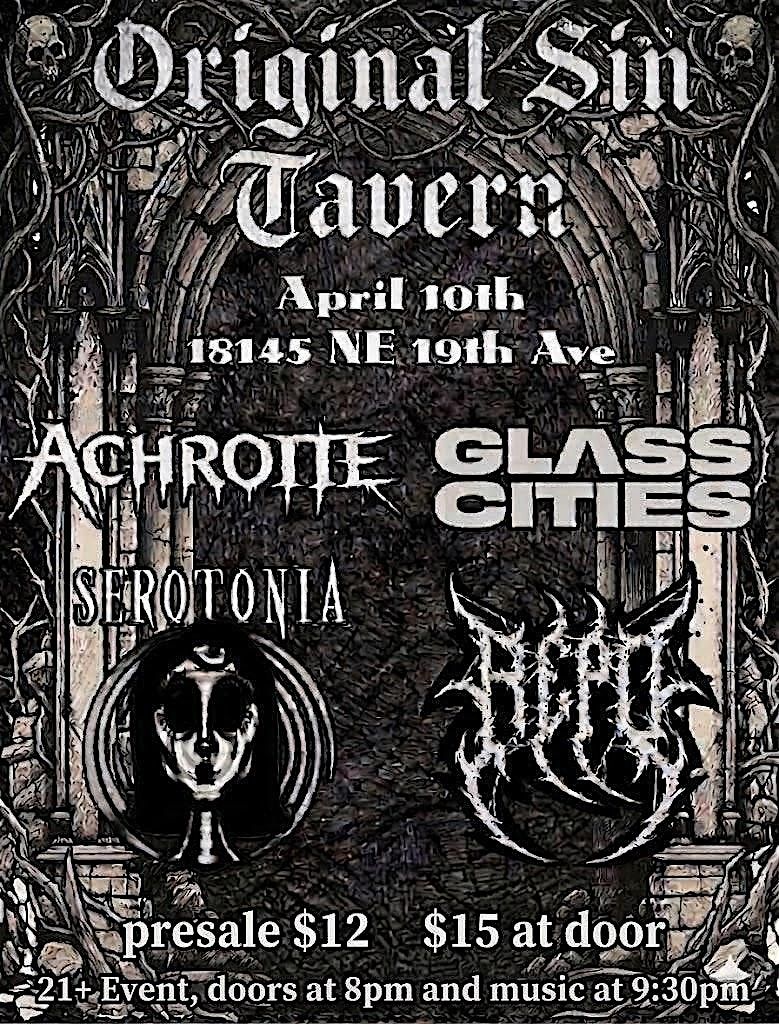 Performances from Repo, Serotonía, Glass Cities and Achroite will begin promptly at 9:30 pm.