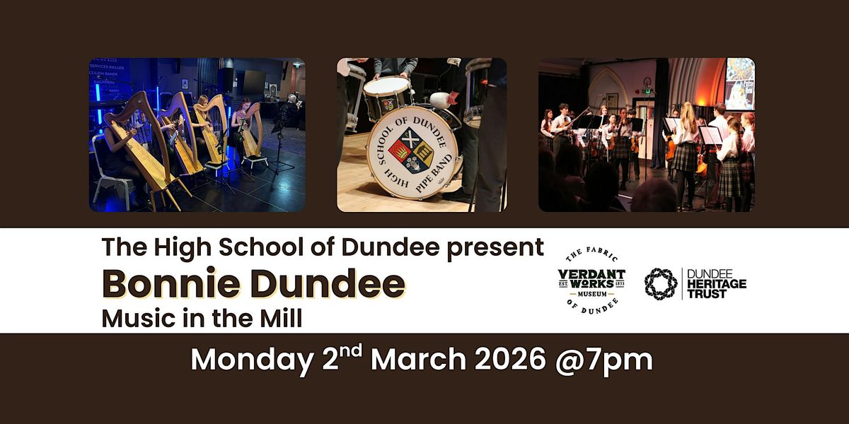 Join the High School of Dundee’s Scottish Fiddle Orchestra, Pipe Band, Clarsachs and Singers as they lead you through an exploration of Dundee’s history through music-making and historical readings. From the 1840s through to the early 20th Century with a strong focus on the jute mill industry.