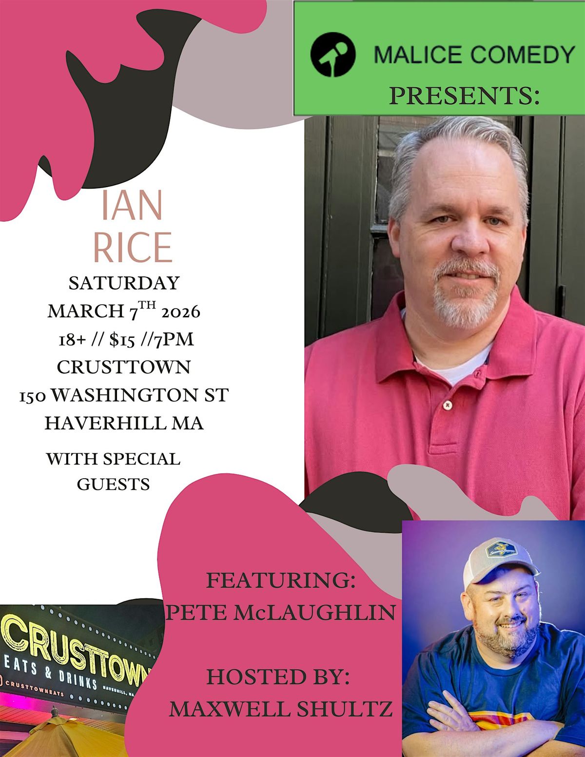 Ian Rice developed his dry, sarcastic sense of humor growing up on the mean streets of Amherst, New Hampshire. He started standup comedy in New Orleans, Louisiana after discovering he could neither cook nor play any musical instruments. Since returning to New England in 2021 he can be seen performing on stages throughout New England and in New York City.