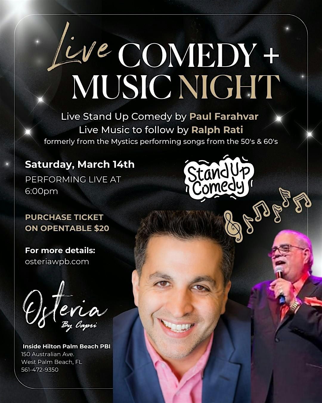 Join us at Osteria by Capri for a special Live Comedy + Music Night on Saturday, March 14th!