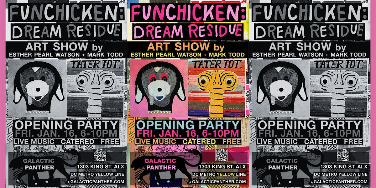 Galactic Panther Art Gallery unleashes FUNCHICKEN: DREAM RESIDUE, a blast of collaborative chaos by artists Mark Todd and Esther Pearl Watson. This exhibition drops viewers straight into the warped, neon-soaked brain of Funchicken: a DIY universe fueled by zines, copy-machine mutations, 80s weirdness, and unapologetic absurdity.The artists have traveled from California to install the show and to attend the opening on Friday, January 16, 6:00 to 10:00 PM at Galactic Panther, 1303 King Street, Alexandria, Virginia.