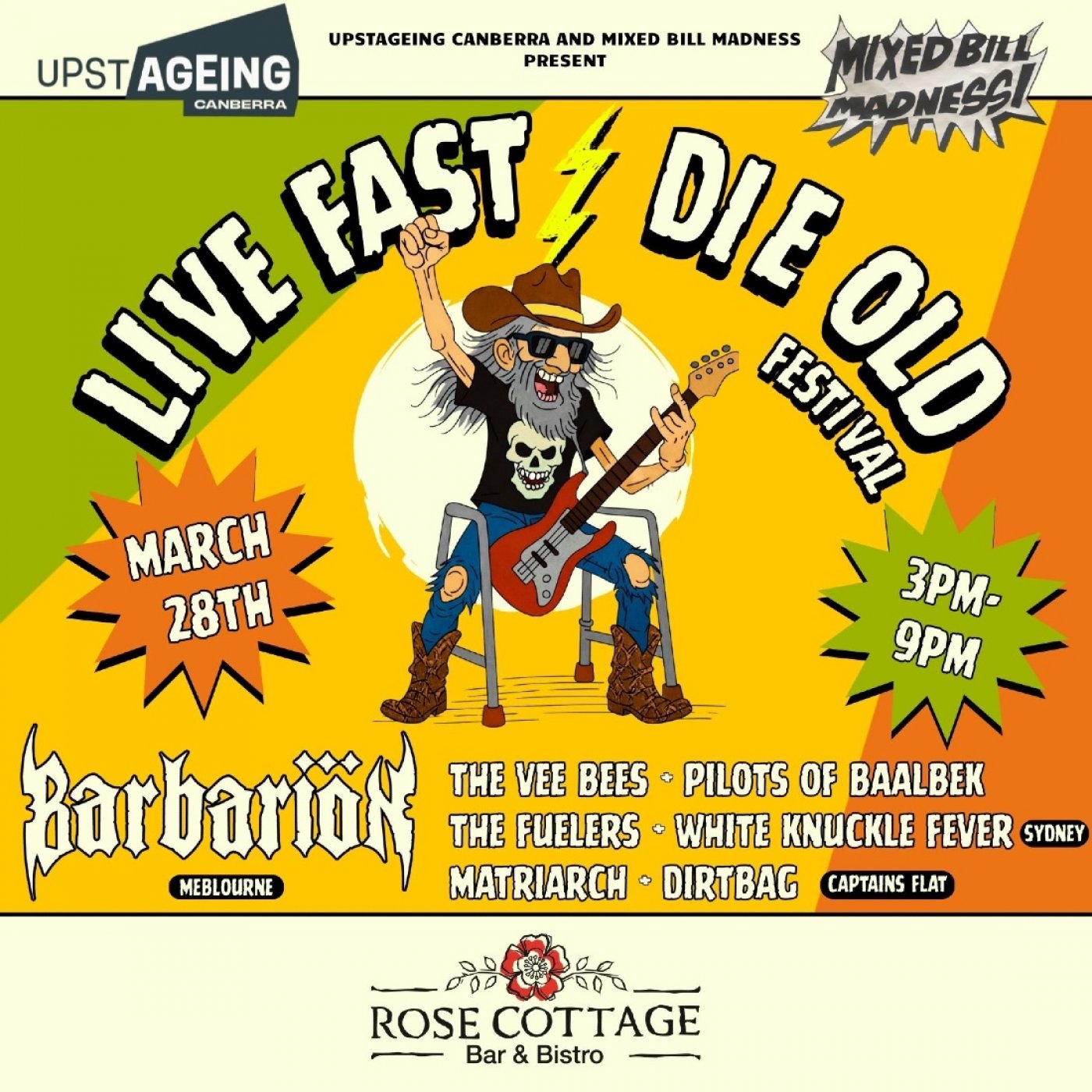 Presented by Mixed Bill Madness, LIVE FAST DIE OLD is a part of UpstAGEING arts festival for old buggers, and features the best good time party bands we could scrape off the stage floor.