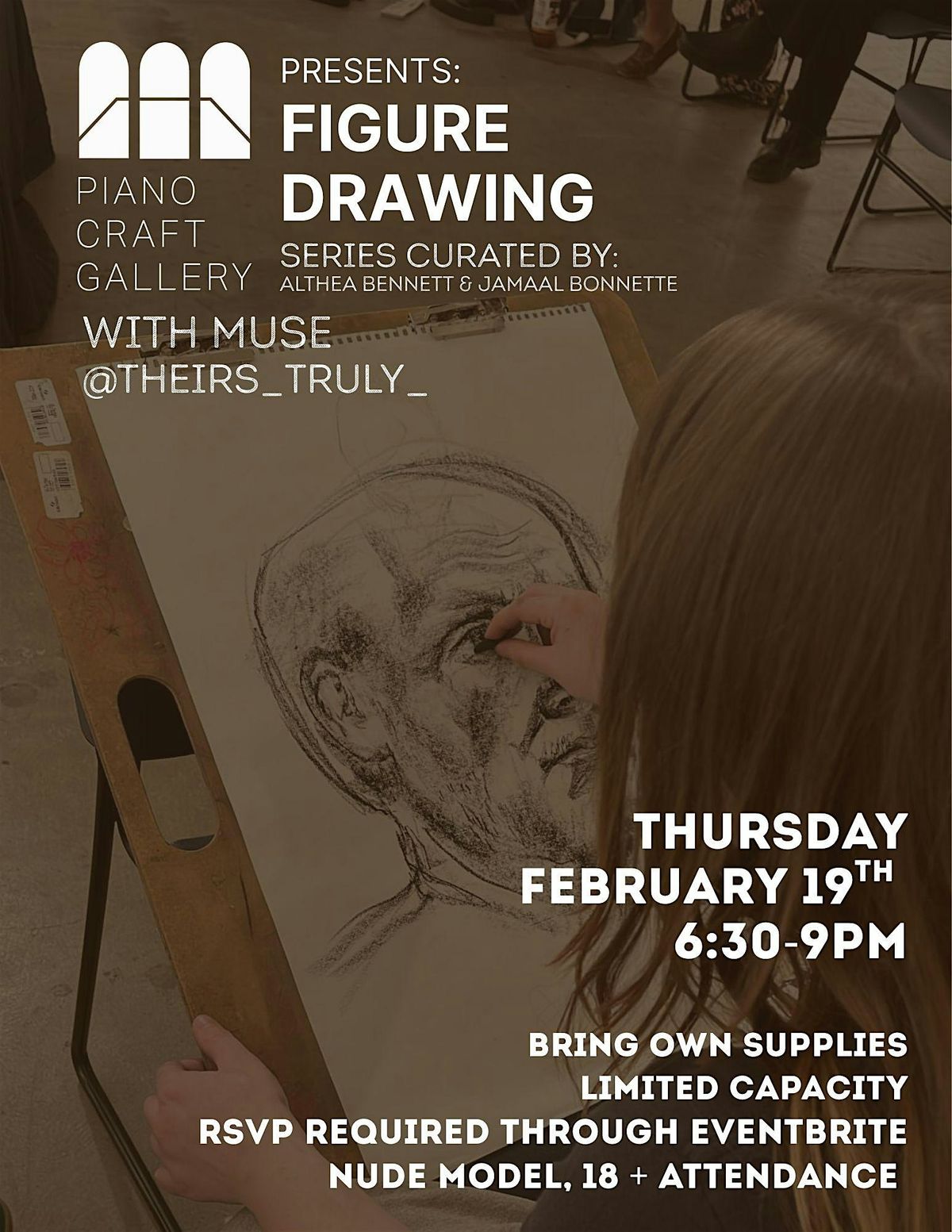 Live Figure Drawing is back at The Piano Craft Gallery! Develop your figure drawing skills with artists and directors Althea B Bennet & Jamaal Bonnette! Participants will practice figure drawing with a live model through gesture sketches and longer-duration observation. This in-person event is perfect for artists of all levels looking to practice their drawing skills. Grab your sketchbook and pencils and get ready to capture the beauty of the human form. Whether you're a seasoned artist or just starting out, this event is a great opportunity to hone your craft. All skill levels are welcome. Participants are asked to provide their own media supplies.