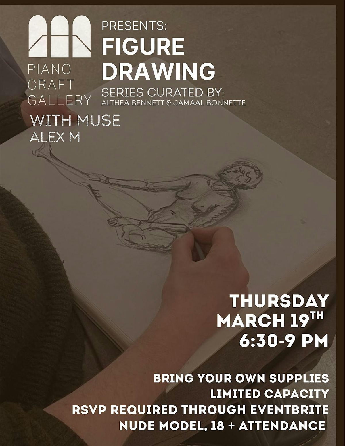 Live Figure Drawing is back at The Piano Craft Gallery! Develop your figure drawing skills with artists and directors Althea B Bennet & Jamaal Bonnette! Participants will practice figure drawing with a live model through gesture sketches and longer-duration observation. This in-person event is perfect for artists of all levels looking to practice their drawing skills. Grab your sketchbook and pencils and get ready to capture the beauty of the human form. Whether you're a seasoned artist or just starting out, this event is a great opportunity to hone your craft. All skill levels are welcome. Participants are asked to provide their own media supplies.