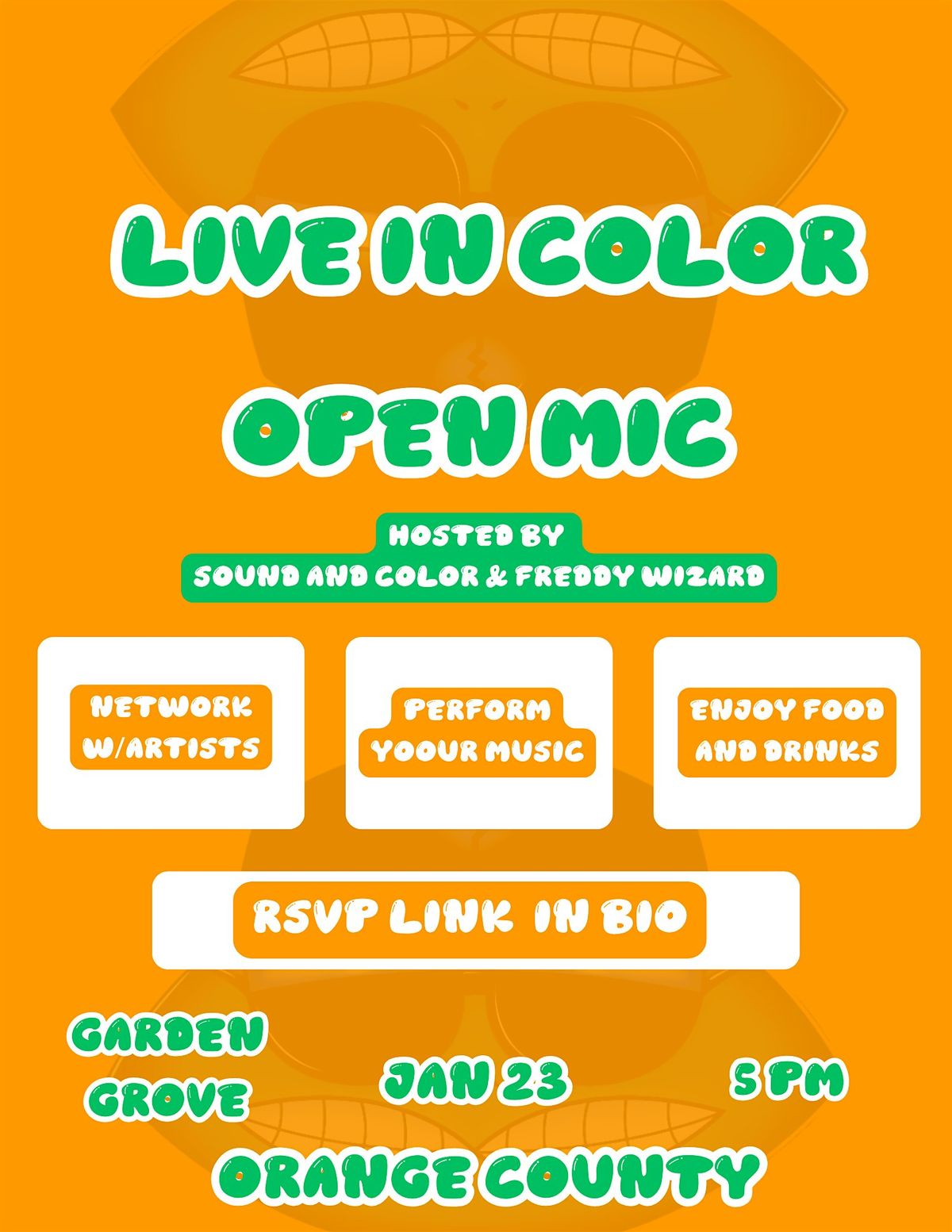 Get ready to express yourself and soak up some good vibes at the Live in Color Open Mic! This is your chance to take the stage or just kick back and enjoy raw, live talent in person. Whether you're a poet, musician, comedian, or just love catching fresh, creative acts, this event’s for you. Come join the fun, meet new people, and celebrate creativity in full color!
