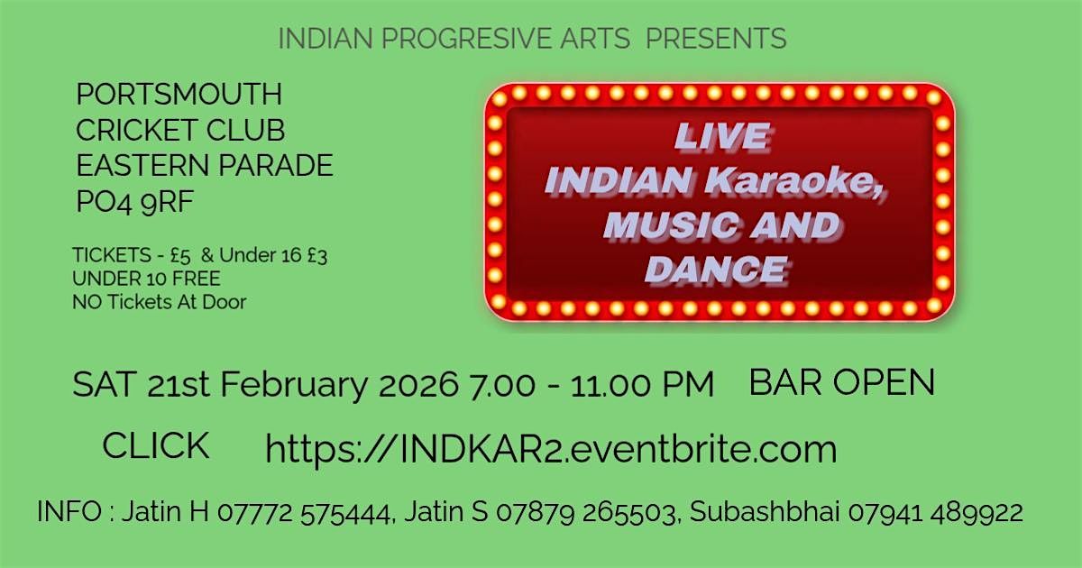 Come join us for a night of Indian karaoke music and dance at Portsmouth Cricket Club, Eastern Parade! Get ready to showcase your singing skills on popular Bollywood songs or hit the dance floor with your best moves. Whether you're a seasoned performer or just looking to have some fun, this event is perfect for all music and dance enthusiasts. Don't miss out on this lively evening filled with great music, dancing, and good vibes! sing your favourite song in any language : Hindi,Punjabi, Marathi, Tamil, Bengali and more !!!!