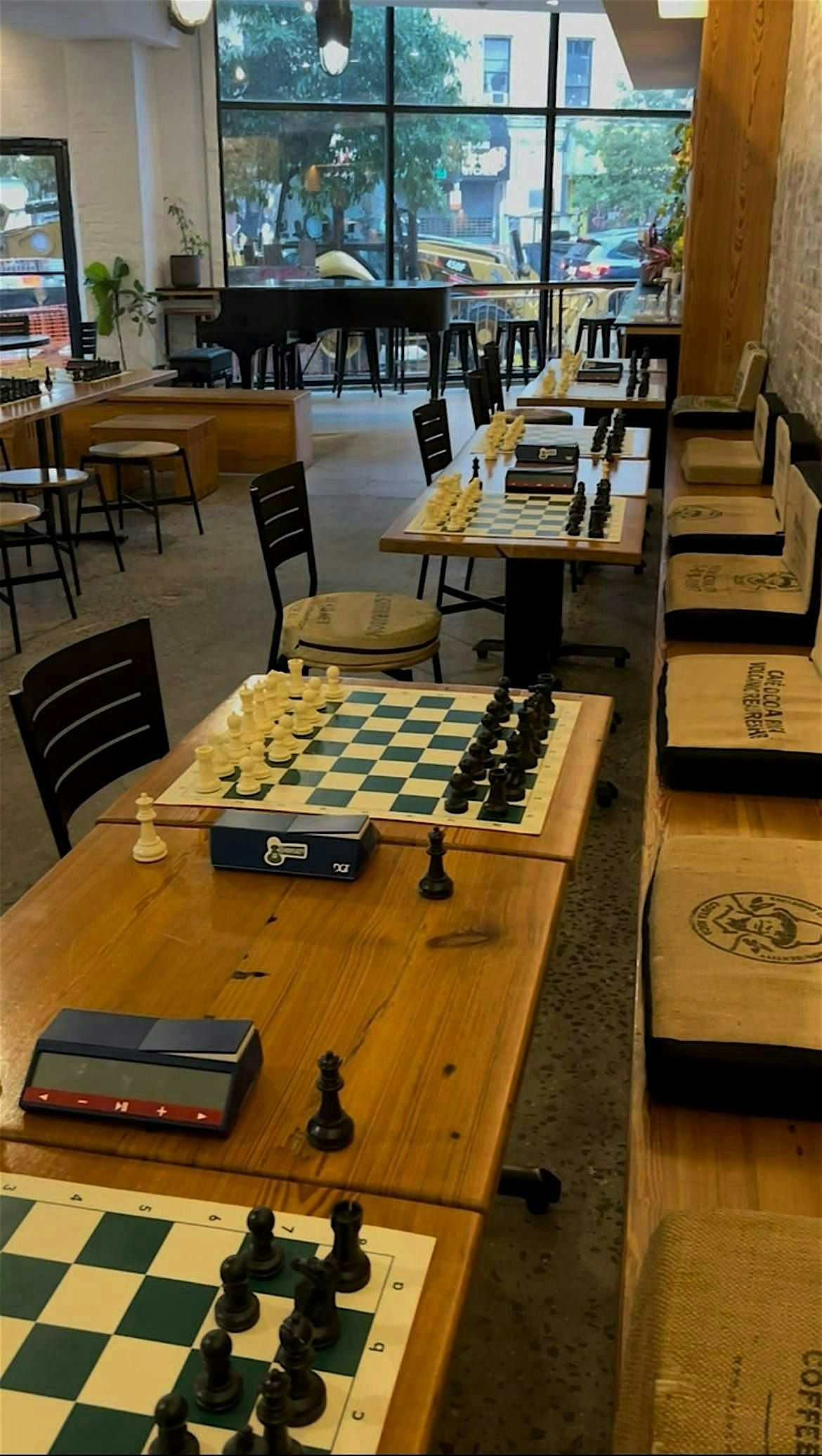 Entry includes unlimited chess, two sets of live jazz, one complimentary beverage (draft beer, craft cider, wine, coffee, orange juice, or seltzer), and complimentary small bites (charcuterie boards with fruit, cheese, hummus, olives, nuts, crackers, bread, and focaccia sandwich bites).