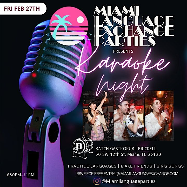 Join us for a Karaoke Miami Language Exchange in beautiful Brickell, Miami! 🎤🎶