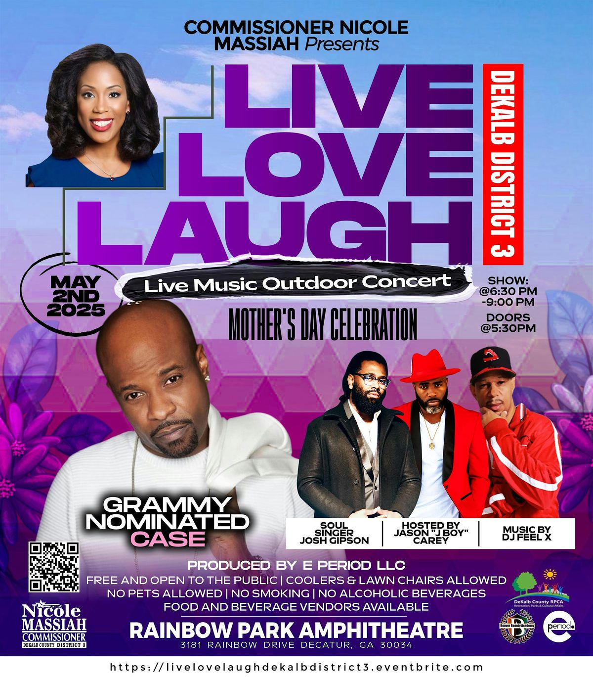 Get ready for an incredible evening of music, community, and fun under the stars! DeKalb County Commissioner Nicole Massiah invites you to Live Love Laugh DeKalb, a FREE outdoor concert experience designed to bring our community together.