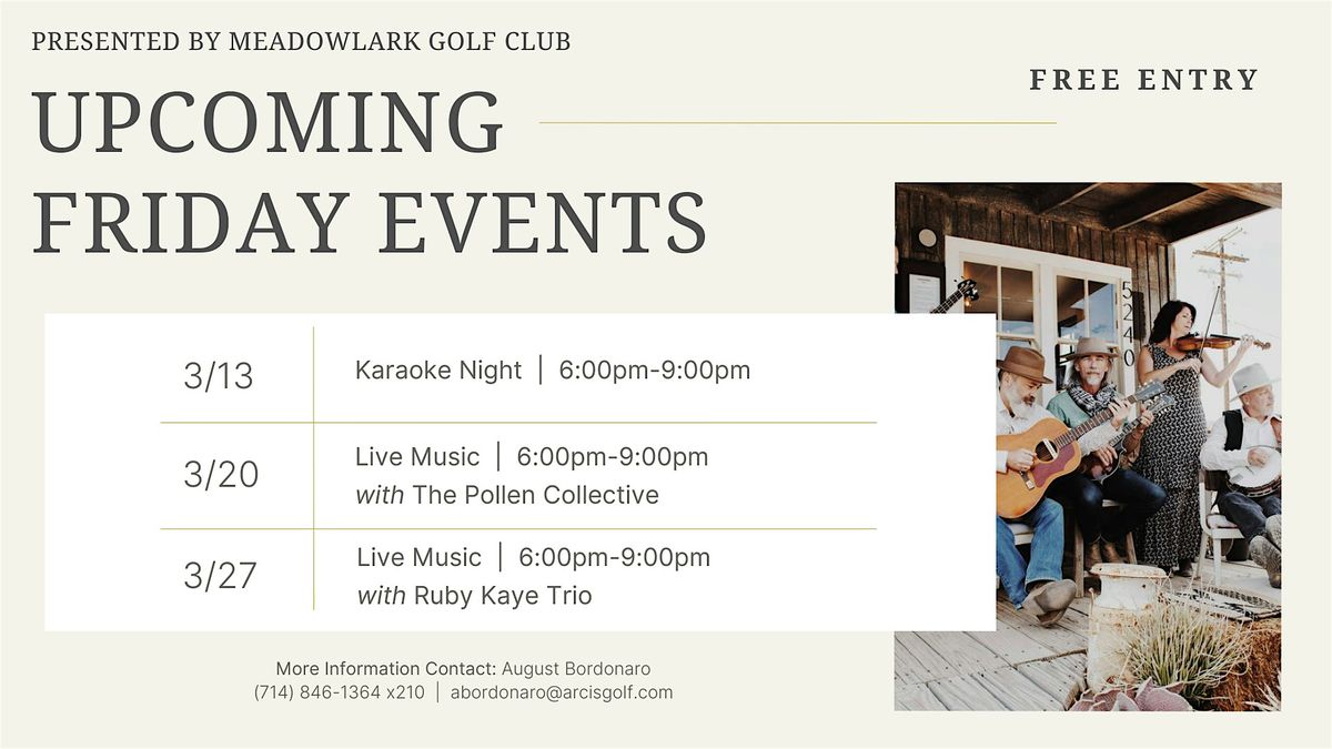 Get ready to have some fun whether it's post round or just coming in purley for some entertainment! Join us in person at Meadowlark Golf Club for a lineup of awesome events that you won’t want to miss. Whether you're looking to show off your singing skills, or just hang out with fellow live music fans, we've got something for you. Swing by and be part of the excitement – we can’t wait to see you in the Cafe & Bar at Meadowlark Golf Club !