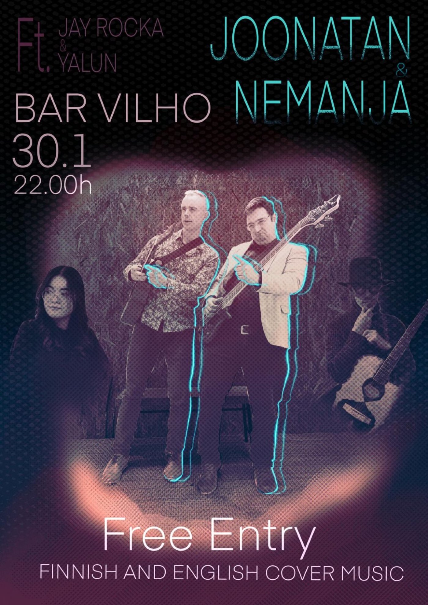 There will be live music at Bar Vilho on January 30th at 22.00h. Joonatan Miettunen and I will play covers from famous Finnish artists like Dingo, Zen Café, Haloo Helsinki!, Eppu Normaali and international hits from Oasis, Bob Dylan and many others. We will have special guest vocalists Yalun and Jay Rocka.