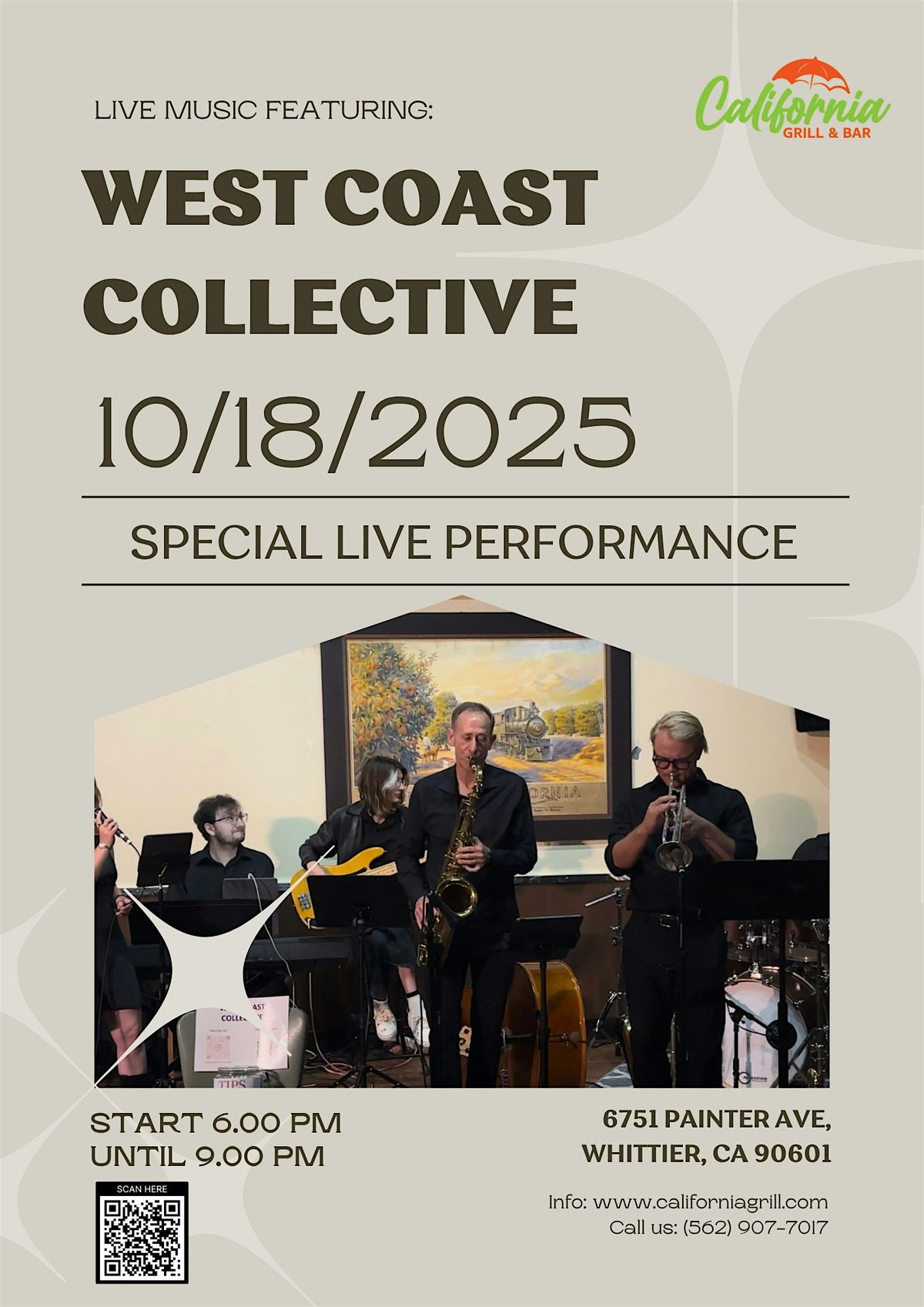 Get ready for an unforgettable night of great food, drinks, and live music! Join us at California Grill & Bar this Saturday, October 18th at 6 PM for an amazing performance by West Coast Collective β bringing you smooth grooves, soulful vibes, and high-energy tunes all evening long! πΈπ€