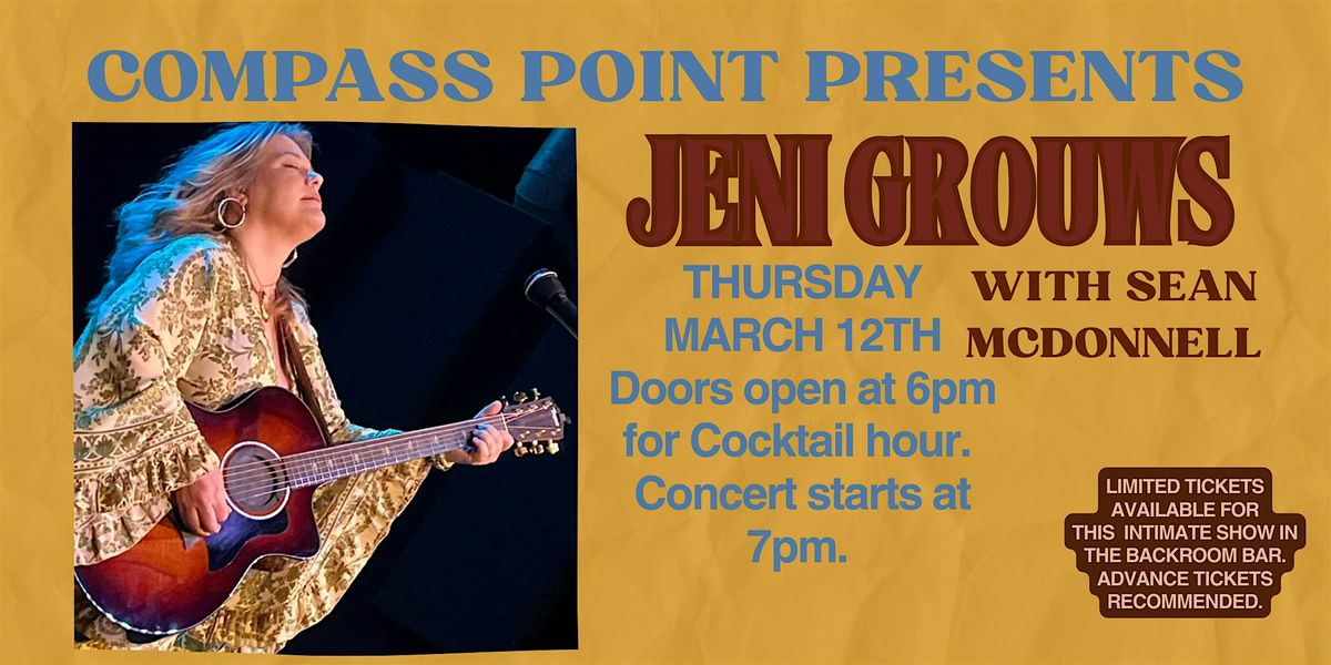 Join Compass Point, home of Dirty Girl Adventures, in The Backroom Bar for a SPECIAL THURSDAY night performance from singer/songwriter Jeni Grouws and KC guitar slinger Sean McDonnell. Together again in The Backroom Bar. If you missed this magical combination of two great musicians last year, this is your chance to see a GREAT performance!