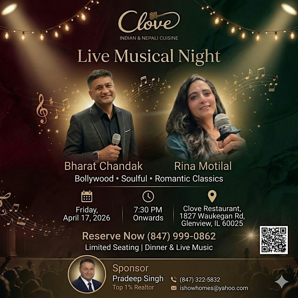 Live Musical Night at Clove!Join us for a soulful evening of Bollywood & Romantic Classics featuring Bharat Chandak & Rina Motilal.
