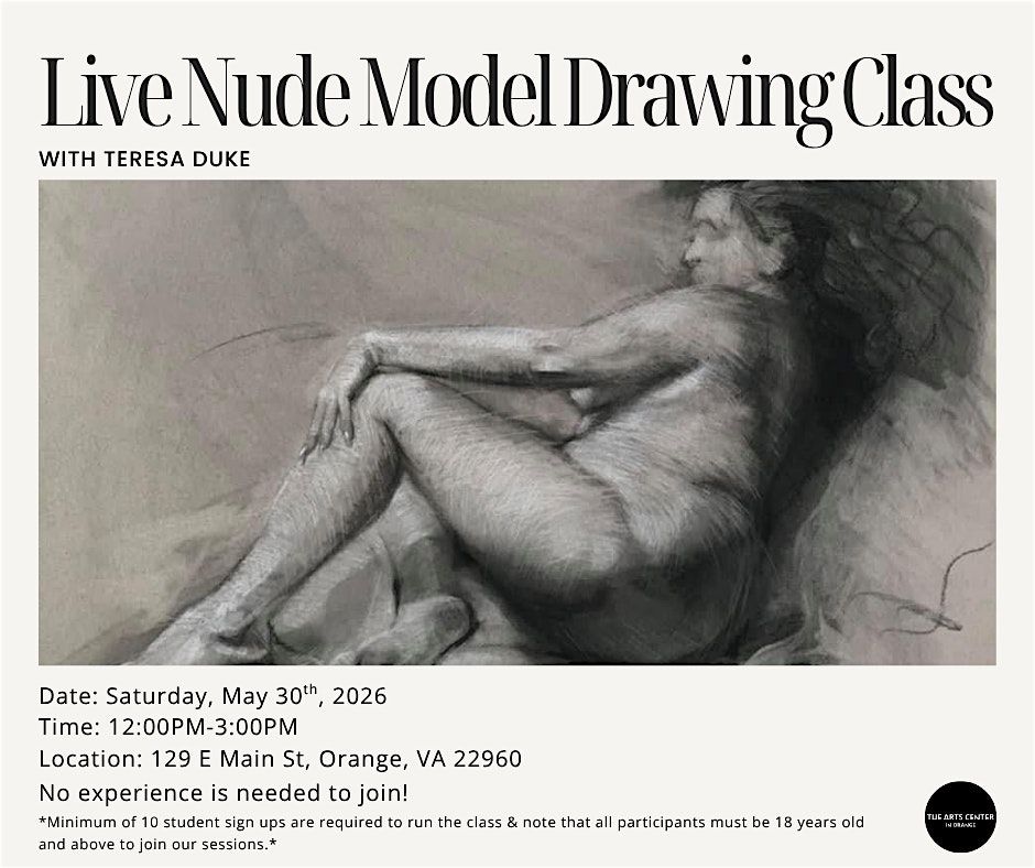 This figurative life drawing open session features a live, nude model posing for quick gestural and long-term poses and is open to the public. Nude life figure drawing holds a pivotal role in artistic education, serving as a fundamental practice that hones an artist’s understanding of anatomy, form, and expression. Our large classroom offers 360-degree views of the model, allowing movement between poses or careful study from one angle. At the Arts Center in Orange, we believe that by studying the human figure in its raw state, we can gain insight into the intricacies of the human form, fostering a deeper connection between artistic representation and the nuances of the human experience. No experience is needed to join! Our instructors are highly skilled, with many years of figure drawing experience to help guide all of our nude life figure drawing session goers. Apart from learning from our instructors, we always encourage our participants to learn from each other through conversations during the breaks.