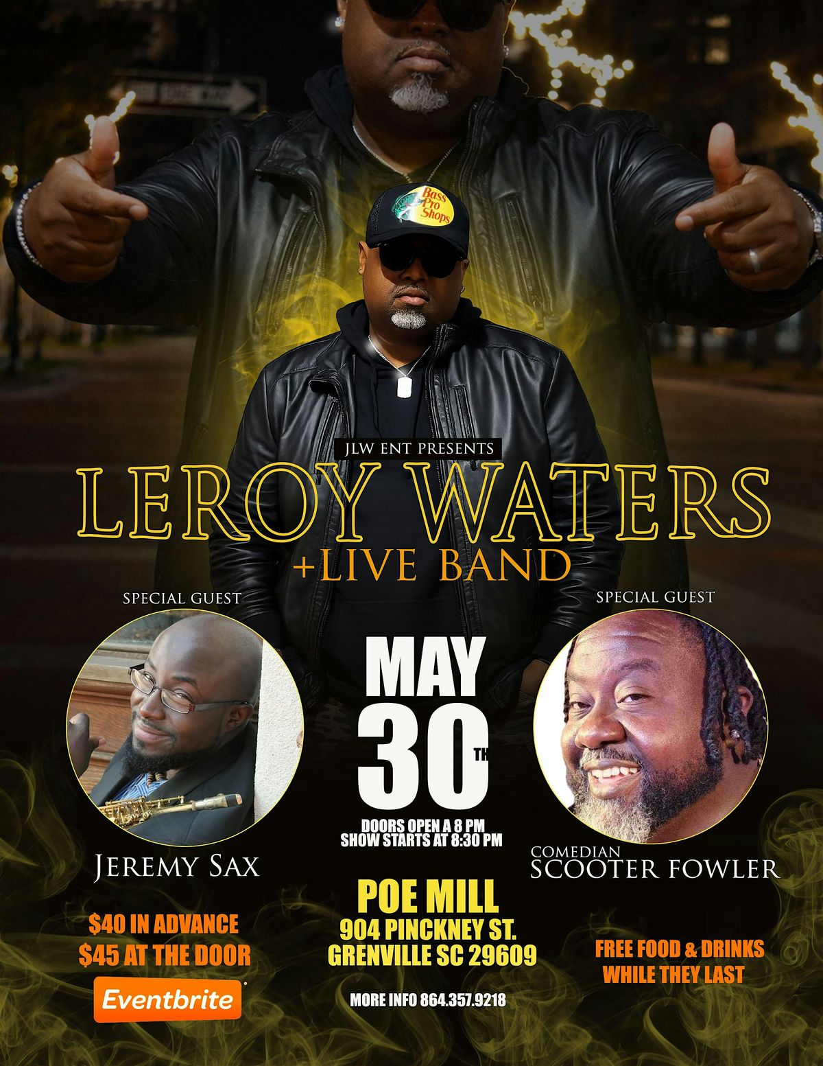 National Recording Artist Leroy Waters has over 25 years of experience in the music buisness and will be bringing his live band to perform some cover classics along with his original music. Specializing in R&B Southern Soul Leroy Waters has been on shows with DruHill, Dave Hollister, JonB, King George, Tucker, Live & The Flesh, Frank Johnson, Xscape, Solo, LL Cool J, Q Parker and Calvin Richardson to name a few. Bringing Special Guest Jeremy Saxe who is one of the top Sax players in Upstate SC and The crazy and Talented Stand up Comedian Scooter Fowler. With your ticket purchase food and beverages will be provided for all guest.Will be and amazing night of music and comedy.