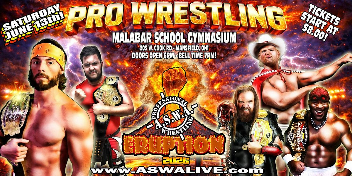 Join us at the MALABAR SCHOOL GYMNASIUM for an unforgettable night of high-energy wrestling action. Mark your calendar for June 13, 2026 at 7:00 PM (Eastern Time) and come cheer on your favorite wrestlers as they battle it out in the ring. Don’t miss the excitement and thrills of ASWA ERUPTION 2026—it's gonna be epic!