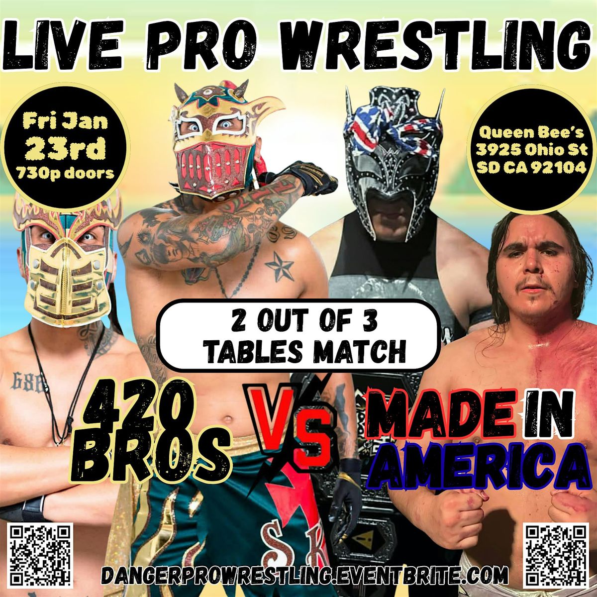 LIVE Pro Wrestling hosted by DANGER! Pro Wrestling at Queen Bee's in North Park is family friendly fun twice a month!About this Event