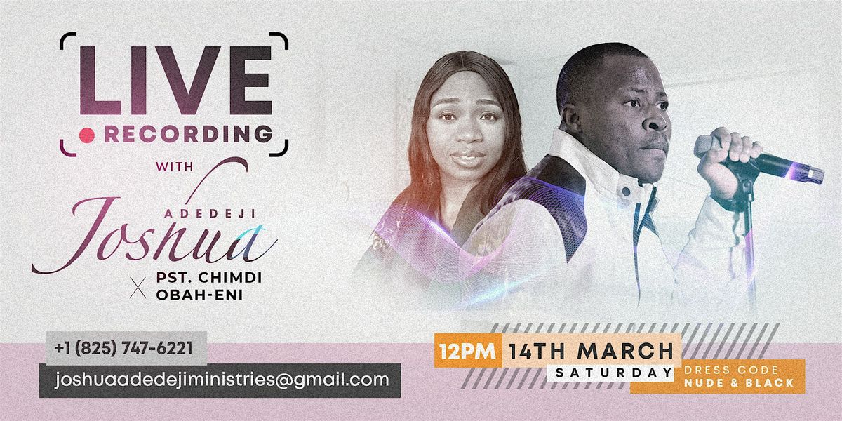An atmosphere set for worship, sound, and the tangible presence of God. You are invited to be part of an unforgettable live recording with Adedeji Joshua featuring Pst Chimdi Obah Eni. This is more than an event, it is a gathering of hearts lifted in praise and voices raised in unity. Come expectant, come ready to encounter God through music and worship. Join us on Saturday 14th March by 12pm and be part of a moment that will be recorded but never forgotten. Dress code is nude and black.