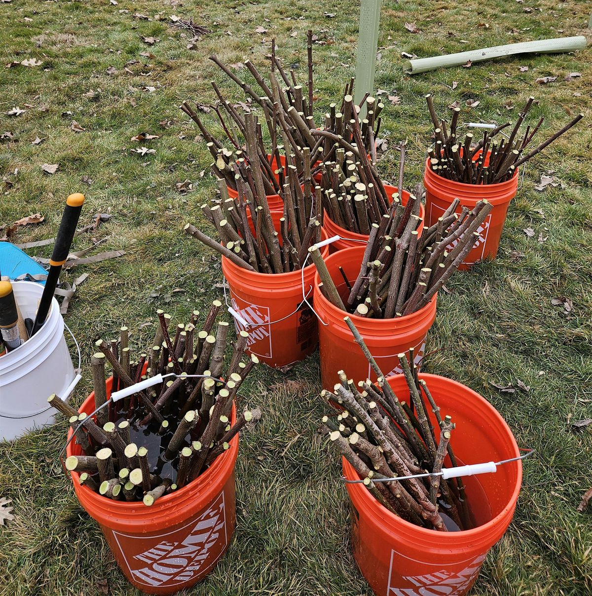 “Livestaking” consists of taking foot-long cuttings of trees and shrubs and directly installing them into the ground. The cuttings will resprout and grow into new individual plants. Livestaking works well with tree and shrub species that are wet-loving and grow relatively quickly. Some common species that can be used as livestakes include elderberry, silky dogwood, buttonbush, winterberry, sycamore, black willow, and smooth alder. Livestaking is done in areas with relatively wet soil, like stream banks or wetlands. It is very commonly used during stream restoration projects as a method to stabilize steep banks or revegetate areas that are very wet. The livestakes need to be installed while the plants are dormant, which is why we are having this event during the early spring before the plants start to leaf out.