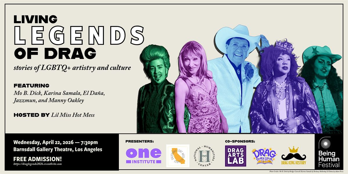 Hosted by One Institute, California LGBT Arts Alliance, Drag Arts Lab, and Drag Story Hour as part of the Being Human Festival (US), supported by the National Humanities Art Center