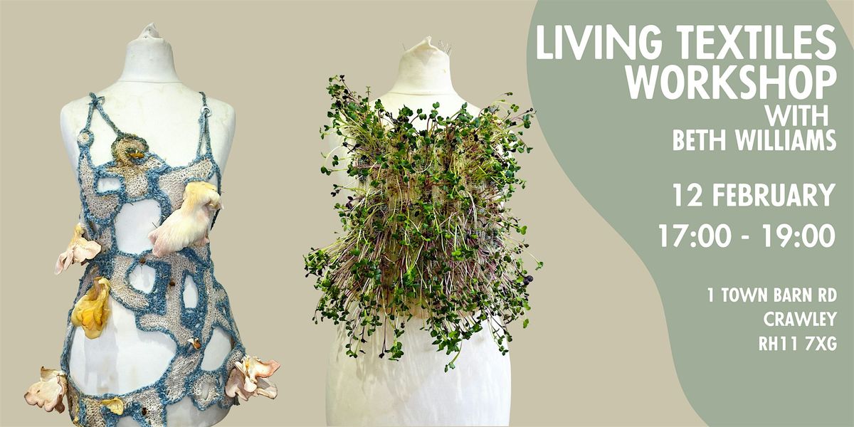 Led by Beth Williams - a designer and artist based between Crawley/London who specialises in living textiles, bio design and knitwear. Beth has trained at the Central Saint Martins College of Arts and currently has a piece on display in the 'Material Worlds' exhibition at Kew Gardens. Their aim is to reconnect their audience to nature by exploring new innovative material and techniques; with the hopes of shifting ideas around the consumption of fashion and textiles.