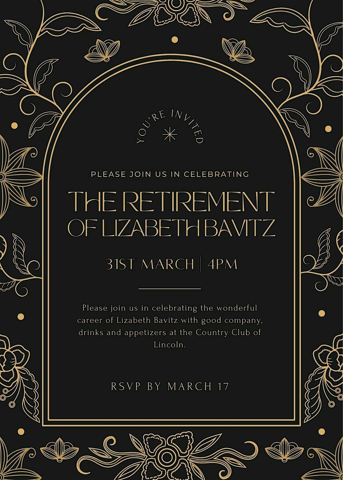 Please join us in celebrating the wonderful career of Lizabeth Bavitz with good company, drinks, appetizers at the Country Club of Lincoln.About this Event