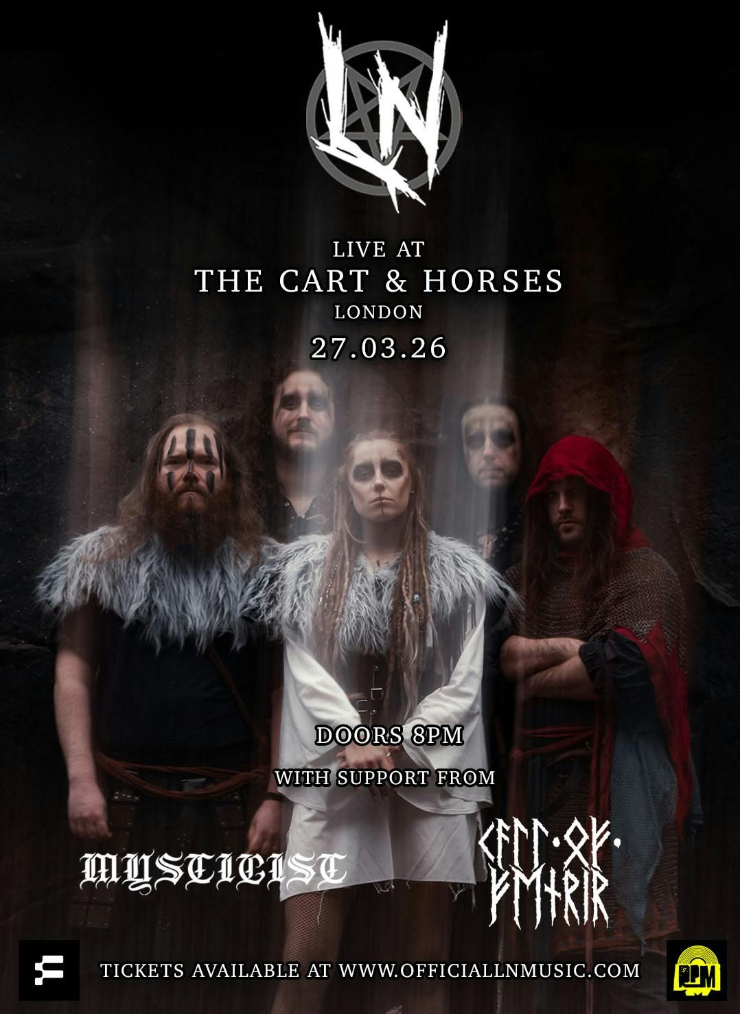 Hailing from Northern shores, Pagan/Viking metal powerhouse that is LN is performing their spellbinding debut ritual at The Cart & Horses on 27.03.26. They are proudly supported by their Folk friends Call of Fenrir and Southern brothers Mysticist.