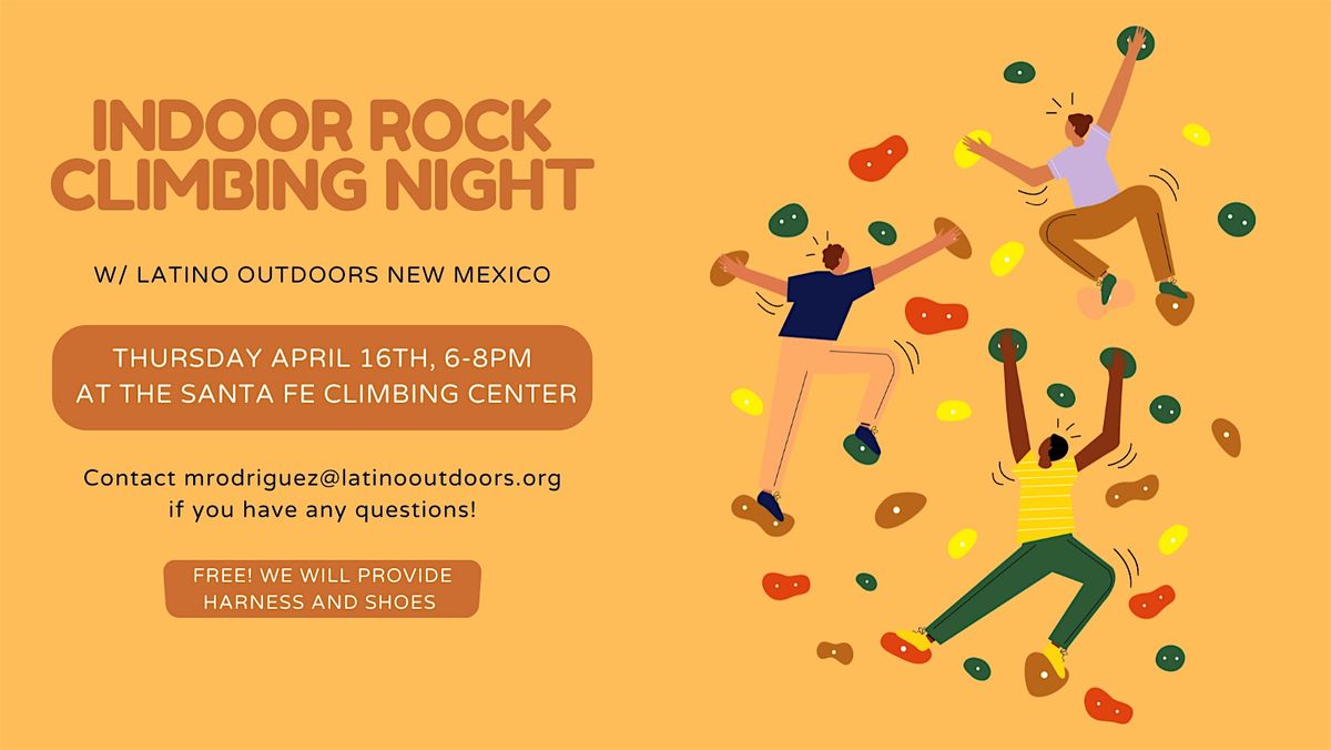 ¡Unetenos para una noche de escalada en el Santa Fe Climbing Center el tercer jueves de cada mes! Todos los niveles de escalada son bienvenidos, de principiantes a personas avanzadas. Todos a partir de los 3 años son bienvendos. ¿No tienes arnés ni zapatos de escalada? ¡No hay problema! ¡Proveeremos zapatos y arneses! Será una noche divertida escalando en comunidad.