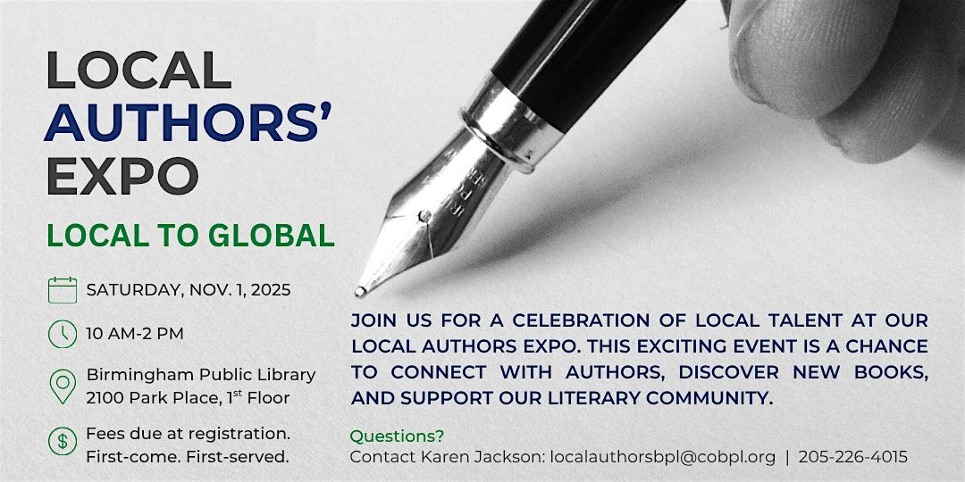 Join us on Saturday, November 1, 2025, at 10:00 AM at the Birmingham Public Library – Central Location for the Local Author Expo! This year's theme, "From Local to Global," celebrates the power of storytelling and its ability to connect communities both near and far. You'll have the opportunity to meet Alabama authors, explore a variety of books, and hear insights from keynote speaker Jim Reed, owner of Jim Reed Books. Firehouse Subs will provide lunch for registrants, so please complete the lunch questionnaire during registration.